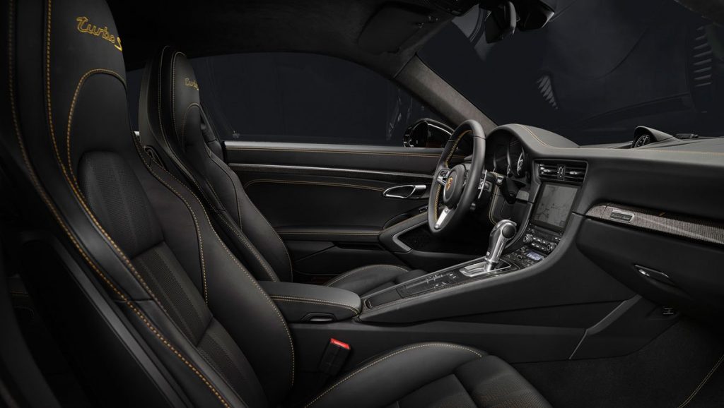 Son habitacle est des plus réussis. À la fois élégant et racé, cette 911 Turbo S Exclusive Series dispose de série de sièges sport réglables recouverts de deux pans de cuir perforé. Agrémenté de deux bandes centrale en jaune d’or et de surpiqûre de la même couleur, les sièges disposent également d’appuie-têtes relevés d’un magnifique logo Turbo S cousu en jaune doré contrasté.