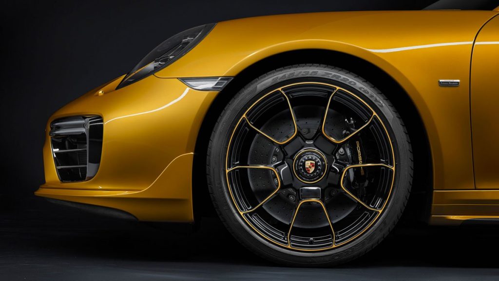 Le 911 Turbo S Exclusive Series est livré avec de magnifiques jantes de 20 pouces peintes en noir avec écrou de verrouillage central de série. La couleur de série est un somptueux Golden Yellow Metallic en utilisant une nouvelle technologie laser. Pour toujours plus d’exclusivité, la 911 Turbo S Exclusive Series est proposée pour la première fois avec un système de freinage en céramique PCCBnon pas peint en jaune, mais en noir avec le logo Porsche peint en Golden Yellow Metallic. À noté que le Pack Sport Chrono est inclue de série.